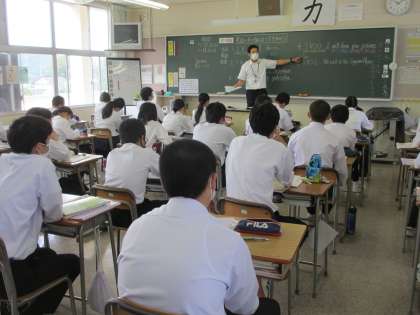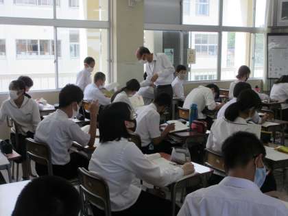 1組の英語では、英文をどのように組み立てるのか、先生の話を聞き、熱心にノートに記述していました。また、2組の国語では、文法はどのように種類分けできるかプリントをもとに学習していました。わからない問題を友達と話し合い解決している姿が印象的でした。