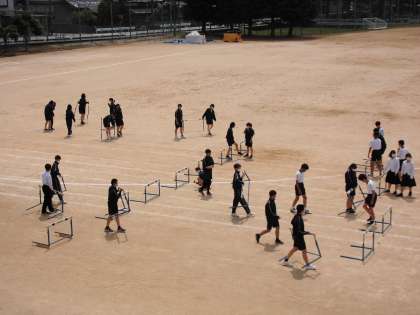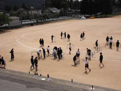 保健体育では、今、ハードルを行っています。「飛ぶのではなく、またぐように」わかってはいますがなかなかうまくいきません。でも、みんなとっても楽しみにしています。しかし、ハードルは準備が大変です。そこはチームワークよく、みんなで行います。では、さあ、始めましょう。