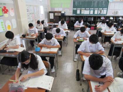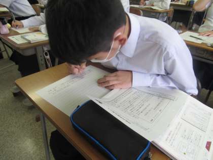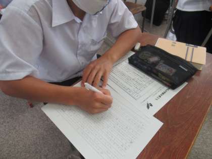 本日の総合の時間では、社会体験活動でお世話になった営業ワイエムアイさんに向けての感謝の手紙を書きました。まずは、一般的な手紙の書き方の礼を提示し、下書きという形で書き始めました。初めての形式に戸惑いながらも気持ちを込めて書いていました。