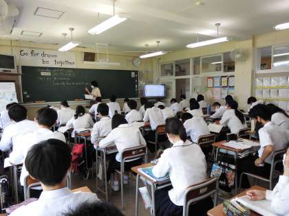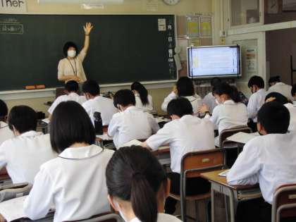 英語では、学習内容によってプロジェクターとモニターを使い分けています。モニターだと多少明るくてもよく見えます。さらに、黒板を広く使いたいときには最適です。さあ、6時間目だけど気合いを入れて。右隅の扇風機もフル稼働です。期末考査も目前に迫ってきましたよ。もうひとがんばりしましょう。