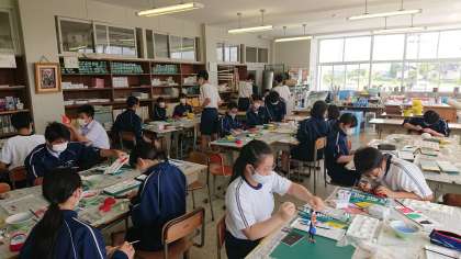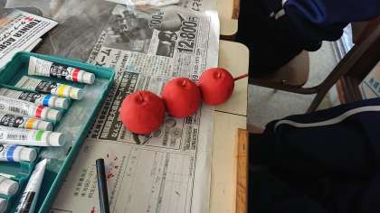 6月17日(木) 2年生「授業風景その1」 公開日 2021/06/17 更新日 2021/06/17 2年生 2年1組の美術の授業です。 自分がイメージするリンゴを紙粘土で成形し、思い思いに着色しています。