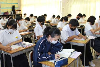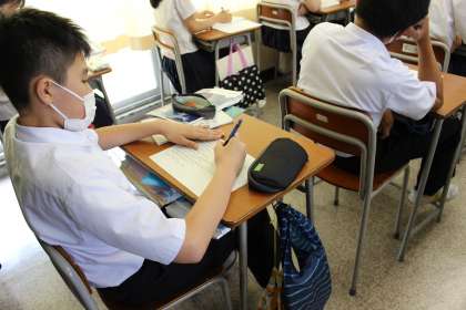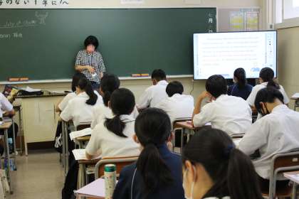 英文を聞いて空欄に英単語を書き入れる小テストも行われていました。