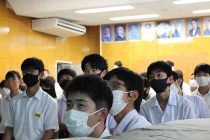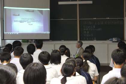 今日は、少年期に富山大空襲を体験された講師の先生をお迎えし、その体験や戦争中の暮らし、世界情勢などについてお話を伺いました。多くの映像資料を使いながら戦争中の厳しさを具体的に分かりやすくお話しくださり、生徒達が食い入るように資料を見つめている表情が印象的でした。