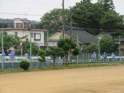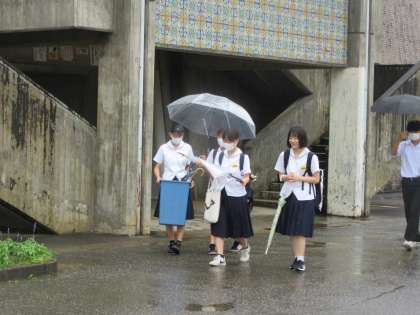 自転車通学生は、カッパを着て運転しにくいと思われますが、1列通行で安全に登校しています。