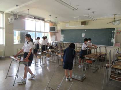 教室は、机と椅子の脚のほこりを丁寧に拭き取りました。