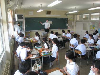 1組は英語。ALTの先生からの質問に対して、グループになって考えていました。