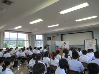 校外学習についてでは、10月に予定している金沢郊外学習に関して行動範囲やスケジュールなどを簡単に説明しました。班別で金沢市内を探索していくので、夏休みに自分が興味のある場所やものを調べるようお願いしました。