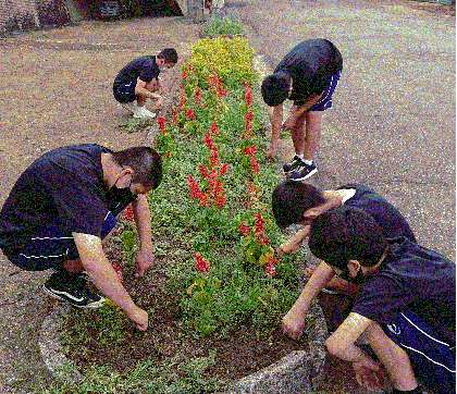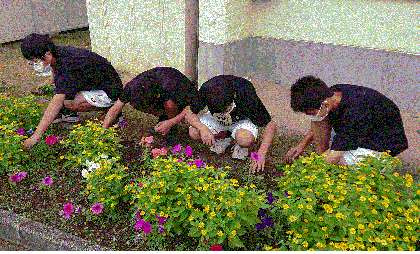 本日、男子バスケットボール部は練習、学習時間の前に花壇の除草作業をしています。夏の暑さで元気に育った草を丁寧に取っています。部活動や学習だけでなく上中生として、環境整備活動にもがんばっています。