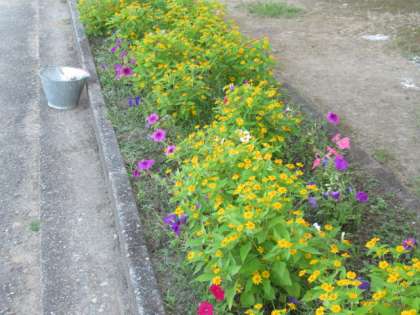 8月3日(火)「花壇と睡蓮鉢」 公開日 2021/08/03 更新日 2021/08/03 お知らせ※2024以前 暑い夏休みになっています。 花壇には当番で水を与えてくれているので、花が元気に咲いています。 理科室の外には睡蓮鉢。オオカナダモだけのつもりが、小さなメダカの稚魚もいるようです。