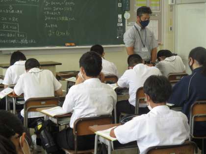 1組は、保健体育の授業です。4人班になり、自然災害に対する備えについて意見を出し合っていました。2組は、数学の授業です。1次関数について、数量の変化に着目し、問題に取り組んでいました。