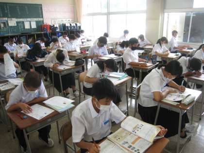 9月2日(木)1年生「授業風景」 公開日 2021/09/02 更新日 2021/09/02 1年生 2限目の様子です。 1組は理科。 復習プリントの各問題に、集中して取り組んでいました。 2組は国語。 場面の展開に沿って、主人公の気持ちの変化を読み取ろうとじっくり考えていました。