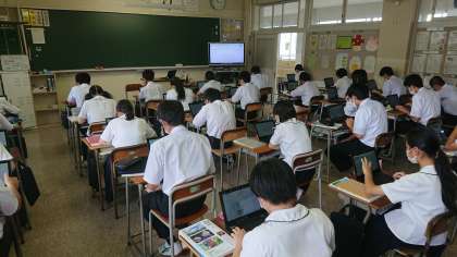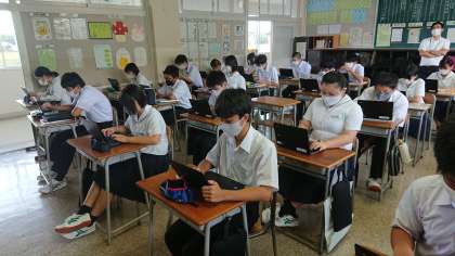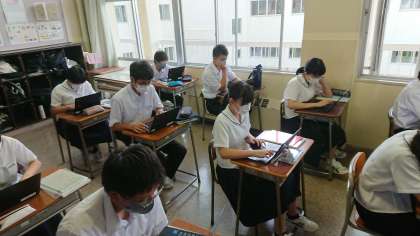 2年1組の理科の授業では、クロムブックを利用し、理科の確認問題に取り組んでいます。みんな集中して取り組んでいます。