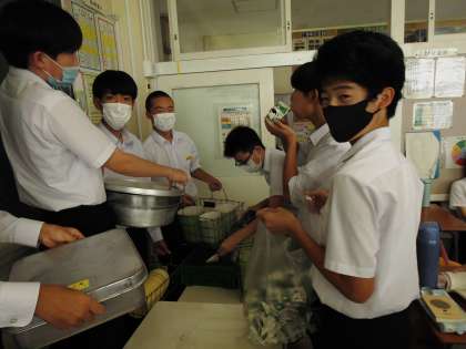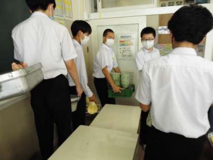 現在、給食委員会により「給食準備・片付け短縮プロジェクト」が実施されています。どのクラスも時間短縮を目指し協力しています。3年1組が秒単位で片付けを終わるのは、写真のようにみんなで協力し、一気に片付けるからです。重いものは男子が運びます。すごいチームワークですね。