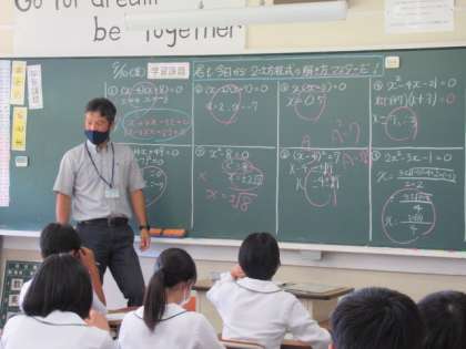 9月10日(金)「互見授業週間」 公開日 2021/09/10 更新日 2021/09/10 お知らせ※2024以前 今週は、教員の研修の一環として「互見(ごけん)授業週間」としています。 学び合いと言語活動に焦点をあて、教員どうしが授業を参観し、感想やアドバイスを伝えています。 よりよい授業づくりに努め、生徒の学力向上を目指しています。 上:3年数学「君も今日から2次方程式の解法マスターだ」 下:2年技術「階段照明の回路の秘密を考えよう」