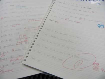 先週に引き続き、月曜日に英語の課題を提出してもらっています。共通の課題もありますが、実力テストの対策として、希望者に英作文添削を始めています。前回のテストの問題の復習、先週出した課題のテーマは「私の趣味」です。自分の思いを英語で表現するには、「言う」よりも「書く」が難しです。でも、練習しただけ自分の力になりますよ。提出してくれた人のノートを紹介します。