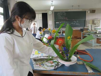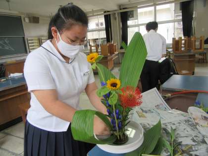 9月13日(月) 華道教室 公開日 2021/09/14 更新日 2021/09/14 部活動 月に一度の華道教室がありました。 今日のお花は、カークリンコ、ピンクッション、りんどう、ひまわりです。 講師の先生から教えていただきながら、自分のテーマに合うよう工夫しています。