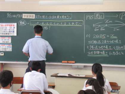 9月15日(水)1年生「授業のようす」 公開日 2021/09/15 更新日 2021/09/15 お知らせ※2024以前 6限目の授業のようすです。 1組は数学。自然数をnという文字にして5の倍数をあらわしていました。 2組は社会科。中国のようすを学習していました。