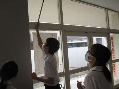 9月15日(水)3年生「清掃時に環境整備」 公開日 2021/09/15 更新日 2021/09/15 3年生 3年生の今日の清掃の様子です。古い校舎ですが今日も一生懸命です。洗面所をたわしやスポンジで力を入れて磨いています。トイレ掃除も水まきごしごし磨き。生徒玄関のガラス窓は隅々まで。角に蜘蛛の巣がないかなぞってみたり。たった15分間の活動でも、こういう風に自分から気がついてくれると学校は気持ちよく過ごせますね。