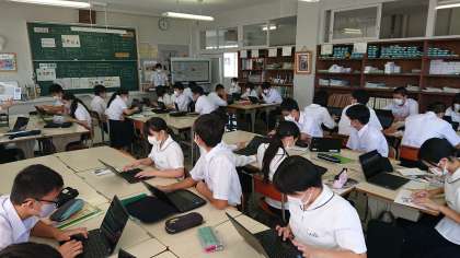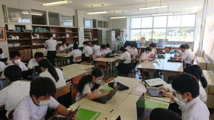 9月16日(木) 2年生「授業風景その1」 公開日 2021/09/16 更新日 2021/09/16 2年生 2年1組は美術の授業です。 オリジナルの文字をそれぞれが作り上げ、各グループでテーマを作り、まとめています。 個性的な文字の作品をみんなでクロムブックを使い、鑑賞しています。