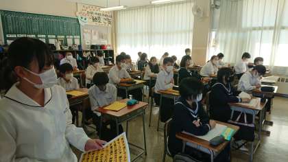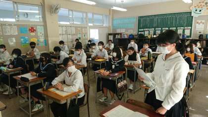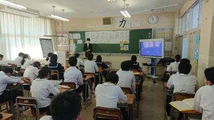10月14日(木) 2年生 「合唱曲について考える その1」 公開日 2021/10/14 更新日 2021/10/14 2年生 合唱コンクールで発表する曲について歌詞や内容について考察しました。歌詞が作られた背景や、作詞者、作曲者の思いも考え、どのように歌えばよいか、みんなで意見を出し合いました。 写真は1組の様子です。