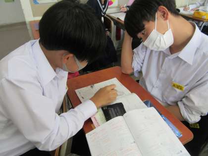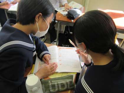 2枚目、3枚目は友達同士で教え合っている様子です。実力テストも近いので、勉強に力が入ってきています。このように、分からないところを友達に聞いて確かめる姿もよく見られるようになってきました。