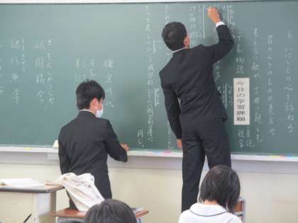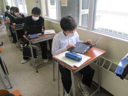 1組は、国語の授業です。『平家物語』の音読や視写を通して、昔の人々のものの見方や考え方を学んでいました。2組は、美術の様子です。自分の作品にタイトルと説明を付けていました。それぞれが工夫して作っている姿が印象的でした。
