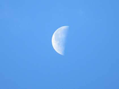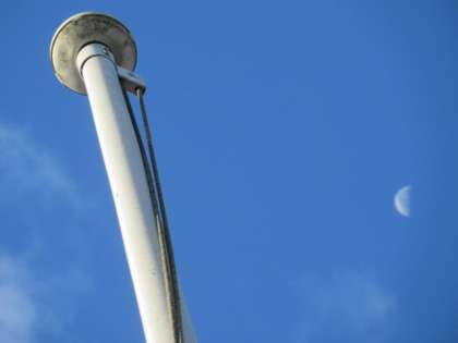 10月29日(金)「上弦の月」 公開日 2021/10/29 更新日 2021/10/29 お知らせ※2024以前 今日は「上弦」 朝7:00の空には、天頂(頭の真上)付近に見えます。 ポールを照らす朝の光と比べると、同じ側が明るいのが分かります。