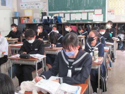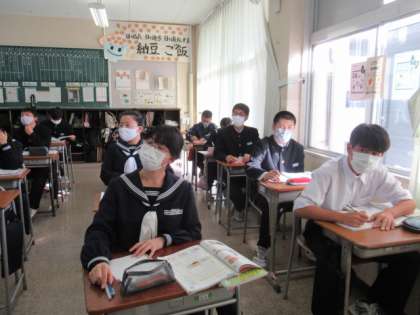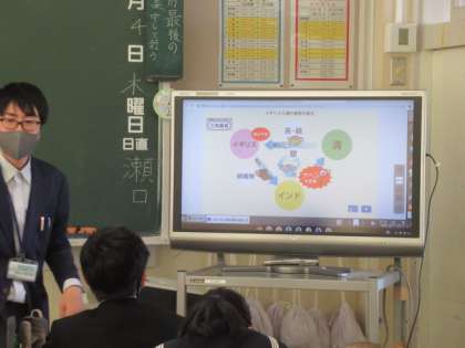 11月4日(木)2年生「午後もがんばるぞ」 公開日 2021/11/04 更新日 2021/11/04 2年生 1組は英語、2組は社会です。 どちらのクラスもモニターを使って、教材をわかりやすく示していました。