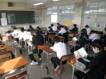 朝読書の様子です。8時15分のチャイムが鳴る前に自分の席に座り、読書から1日をスタートします。静かに15分間読書をして、落ち着いた雰囲気で朝を過ごします。