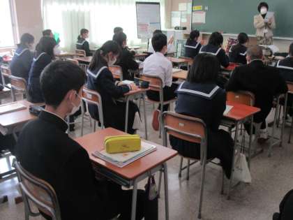 1組は、徒然草を題材に隣同士で読み合いを行っていました。2組では、mustやhave toの使い方を様々な英文から学んでいました。