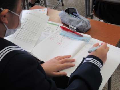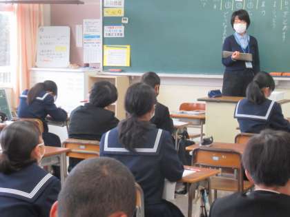 11月12日(金)1年生「授業の様子」 公開日 2021/11/12 更新日 2021/11/12 1年生 2限目。 1組は国語。プリントを解きながら、解答のポイントについて説明を受けています。 2組は数学。比例のグラフの書き方を学んでいます。 「通るのは原点と?」