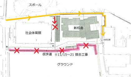 この期間は、社会体育館方面からの歩行者用通路として、新校舎北側を通ることができるようになっています。(画像上、オレンジ色のルート)
