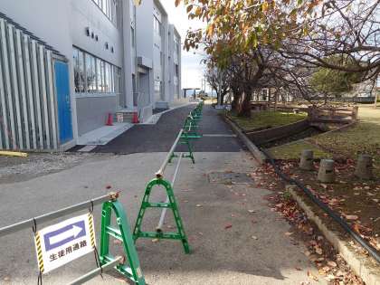 新校舎工事エリアには柵が張られているので、その外側を通ってください。(画像中)