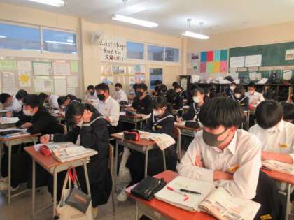 2組は社会で、地方自治について学んでいます。3年生にとって大切な期末テストを前にして、みな真剣な表情です。