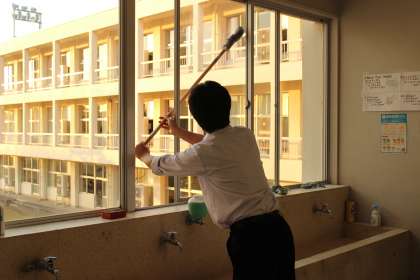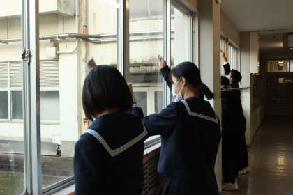 整美委員会とボランティアで、廊下の窓ふきをしてくれています。