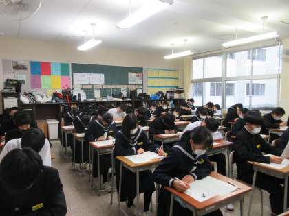 11月24日(水)3年生「今日から3日間、特に気合い入れます。」 公開日 2021/11/24 更新日 2021/11/24 3年生 テストに合わせたかのように、寒さが厳しい一日でした。今日から3日間、期末考査で9教科のテストがあります。3年生の表情は真剣そのものです。今日は、英語、理科、技術・家庭のテストがありました。さあ、あと6教科です。学習の成果が生かされるように頑張りましょう。