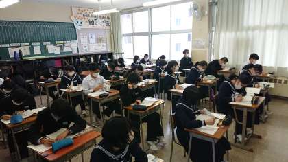 12月13日(月) 2年生「授業風景その1」 公開日 2021/12/13 更新日 2021/12/13 2年生 2年1組は社会の授業です。 関東地域の工業地帯の特色などをワークシートを利用してまとめていました。 みんな集中して説明を聞いています。