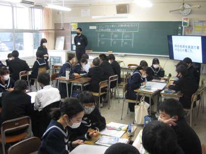 1組は英語。グループで協力しながらレビュークイズに答えて、2学期の振り返りをしていました。
