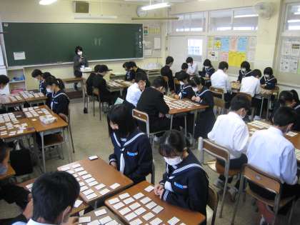 2組は国語。グループごとに白熱した雰囲気の中で、百人一首に取り組んでいました。