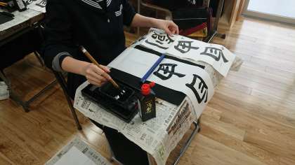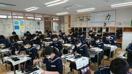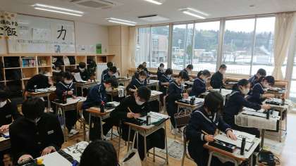 始業式も終え、2年生は新校舎で書き初め大会を行っています。みんなきれいな教室の床を汚さないように、集中して書き初めに取り組んでいます。