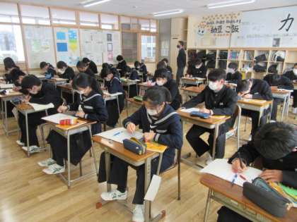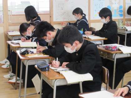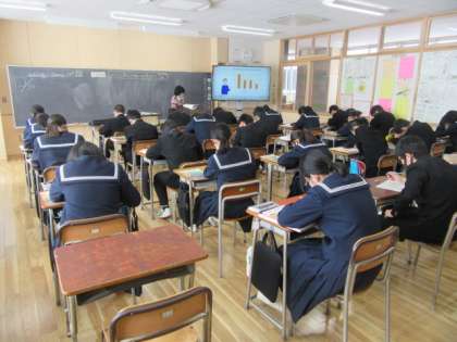 1月19日(水)2年生 「授業風景」 公開日 2022/01/19 更新日 2022/01/19 2年生 4限の授業風景です。1組は数学、2組は英語を行いました。 1組は、平行な直線と面積にどんな関係があるのか考え、問題を解いていました。2組は、英会話を聞き取り、グラフの読み取りを行っていました。 どちらのクラスでも、資料を活用し、考えようとする姿が見られました。