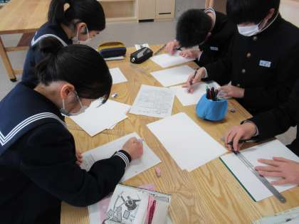 3月8日(火) 2学年 「授業の様子」 公開日 2022/03/08 更新日 2022/03/08 2年生 1,2組の「美術」の授業の様子です。 3学期から漫画をテーマに学習しており、今は班ごとに漫画をつくっています。 ストーリーやキャラクター制作など、班で話し合いながら着実に進めていました。 どんな漫画が完成するのか楽しみです。