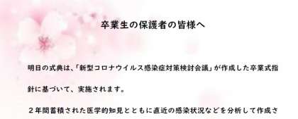 3月14日(月)「卒業生の保護者の皆様へ」 公開日 2022/03/14 更新日 2022/03/14 お知らせ※2024以前 新型コロナウイルス感染症対策検討会議から、標記の文書が配布されましたのでご案内いたします。 なお、本日プリントでも配布しております。 リンク:「卒業生の保護者の皆様へ」