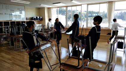 よく働く1年生。6限が終わると、すぐに掃除に取りかかりてきぱきと働きます。