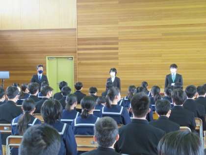 4月6日(水)「担任紹介(第2学年)」 公開日 2022/04/06 更新日 2022/04/06 お知らせ※2024以前 生徒たちはドキドキしながら、学年担当者、担任紹介を聞きました。最後には、教員、生徒共に「よろしくお願いします」の思いを込めて、大山社会体育館に響き渡るような大きな拍手をしました。