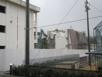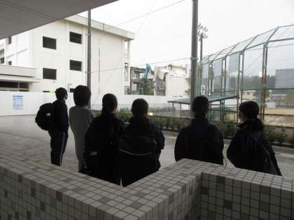 部活終了時、生徒玄関から帰ろうとしたら衝撃的な光景が飛び込んできました。3年生にとって2年間ともに過ごした校舎の一部が、ついになくなろうとしていました。多くの生徒が立ち止まり、名残惜しそうに、今までの感謝の気持ちを込めて見守っていました。・・ありがとう、お疲れ様でした。