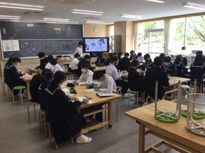 美術室での授業です。「美術とは何か」ということについて考えました。ピカソの絵を鑑賞し、いろいろな描き方・考え方に触れ、衝撃を受けた生徒もいました。