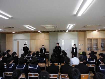 学年集会で、学年プログラム委員会が各自の心意気と学年目標を発表しました。学年目標は「Paint it,・・・」。各行事ごとに「・・・」の部分にそのときに当てはまる色、たとえば「RED」なら、全員で燃えるように情熱をもって取り組もうという使い方です。いろいろな場面で1つの目標に向かって取り組める学年を目指しています。