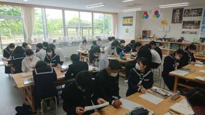 5月13日(金) 3年生「授業風景その2」 公開日 2022/05/13 更新日 2022/05/13 3年生 3年2組は美術の授業です。技術の授業でも学習する一点透視図法について学習していました。様々な有名な絵画でも用いられる図法についてみんな真剣に学習に臨んでいました。