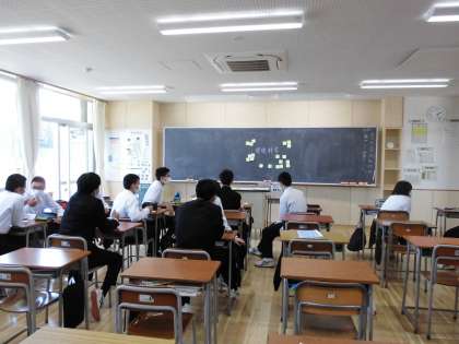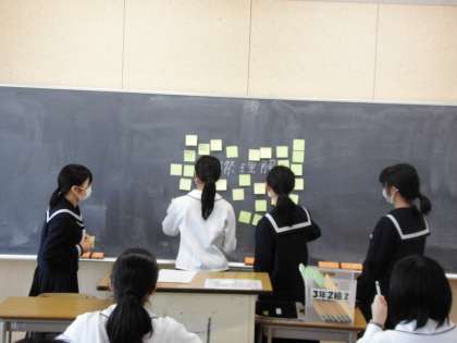 総合学習の時間で「共に生きる」を大テーマとし、各自の希望で「健康福祉」「国際理解」「環境科学」「伝統文化」の4テーマに分かれ、ウェービングを行い、個人テーマを設定しました。これからテーマを個人で追究し、最終的にはいろいろな提言をしていく予定です。上段写真「環境科学」下段写真「国際理解」
